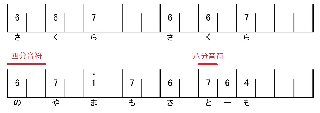 大正琴譜では音の長さの表現には,記号を用います.大正琴譜については解説が他にあるので,ここでは説明しません.